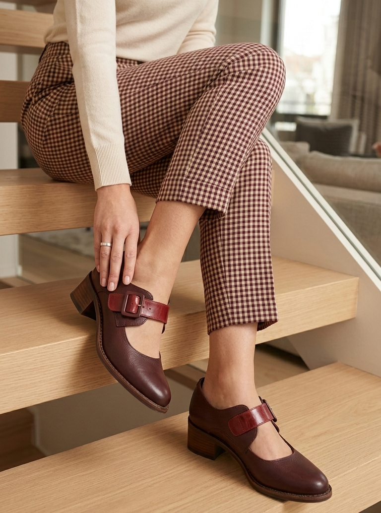 Sapato estilo boneca mary jane em couro com 2 tons de BORDÔ